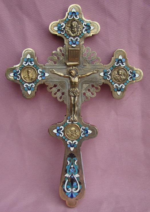 Handkreut mit Email.Russisch,19.Jahrhundert.Versilbertes Messing mit schönen Email-Applikationen.24,5x16,5cm.Sammlerstück!