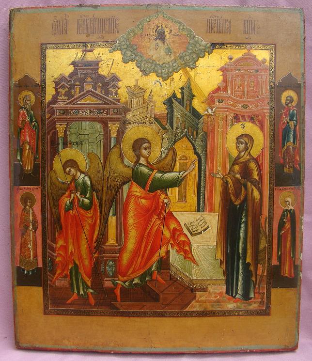 | Verkündigung an die Gottesmutter.Russisch (Palech),Anfang 19.Jahrhundert (um 1810-1840).33x28cm.Oben Gottvater.Auf dem Rand links: Hl.Gurij & Hl.Awiw.Auf dem Rand rechts: Hl.Samon & Hl.Anna.Nur am Rand minimal restauriert.Feinste Palecher Altgläubigen Malerei.Qualitätvolles Sammlerstück! |