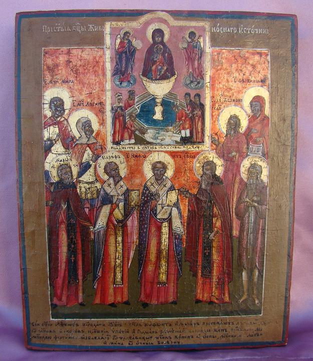 9 Nothelfer und die Gottesmutter Lebensspendende Quelle.Russisch,um 1800. 22,5x18,5cm.Alle Nothelfer und ihre Heilungs-Fähigkeiten sind in der zugehörigen Expertise beschrieben.Seltenes Sammlerstück!
