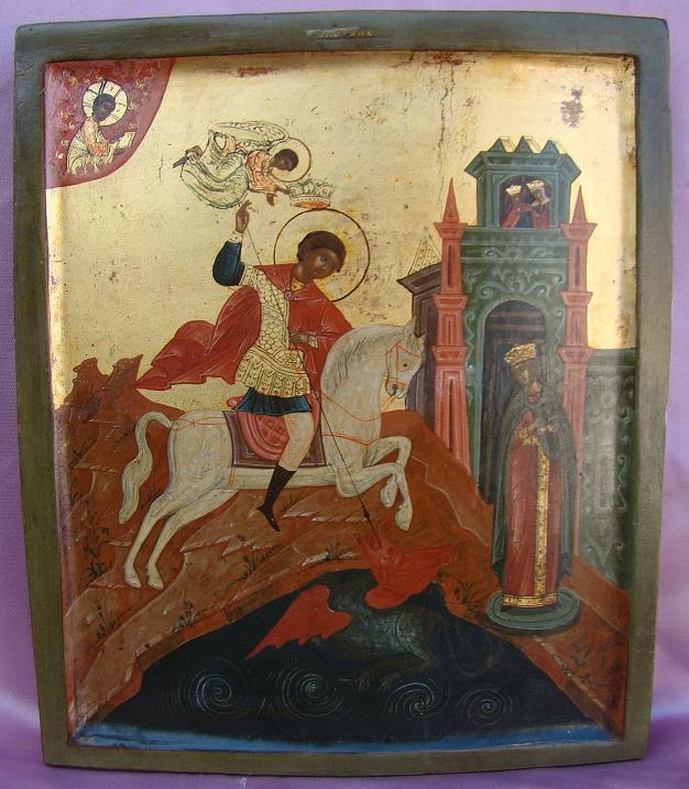 Heiliger Georg.Russische Altgläubigenschule,19.Jahrhundert (um 1830-1870).Vertieftes Bildfeld.25,5x21cm.Der Rand wurde beschnitten (war in einem Rahmen eingebaut).Gute Qualität,nur minimal restauriert.Sammlerstück!