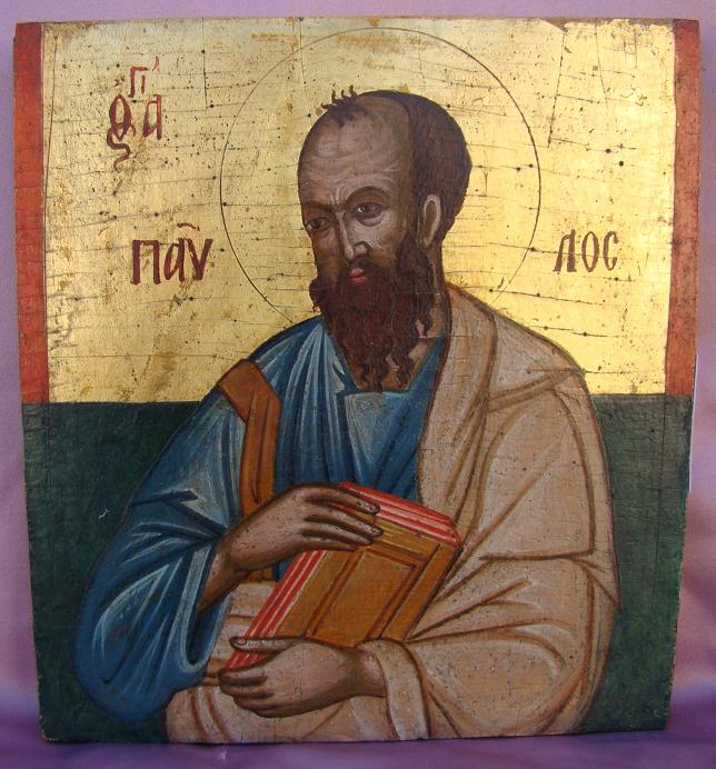 Heiliger Paulus.Griechisch (Kreta),um 1700. 22x20,5cm.Qualitätvolle kretische Ikone,die wohl wegen der fehlenden Umrandung oben und unten,in die Ikonostase einer kleinen Kirche eingebaut war.Beste Erhaltung.Qualitätvolles Sammlerstück!