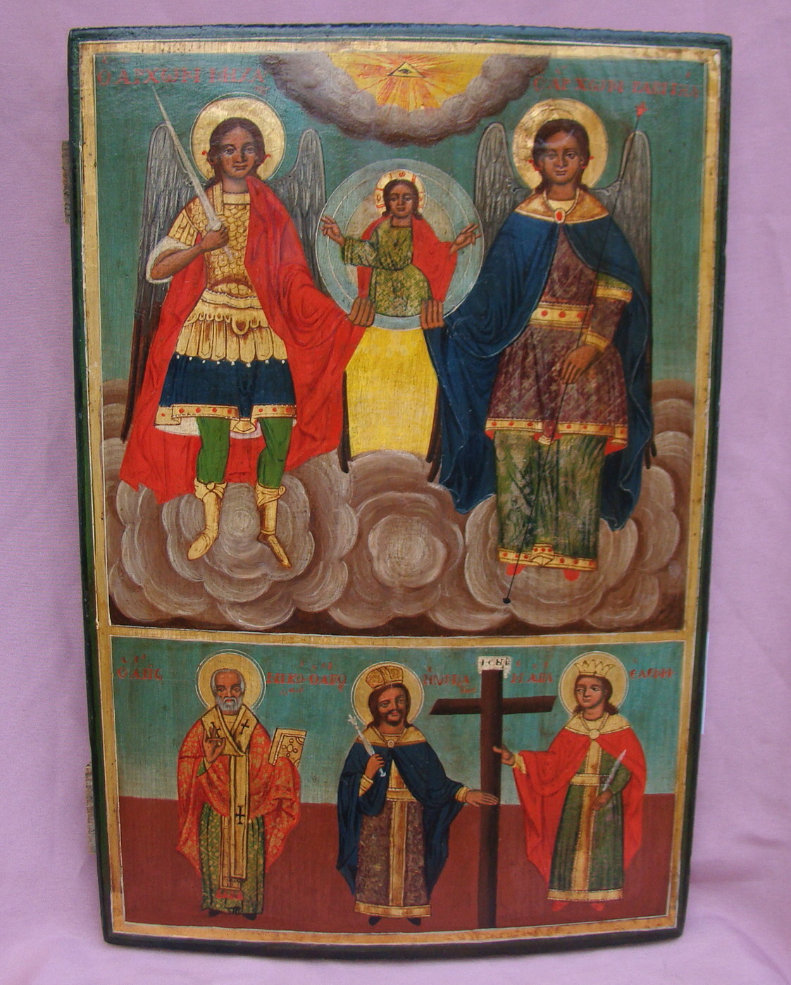 | Große 2 Felder Ikone.Griechisch,19.Jahrhundert (um 1830-1850).50x33,5cm.Oben die beiden Erzengel Michael und Gabriel,die Christus in einer Aureole halten.Unten links der Heilige Nikolaus,rechts das Kaiserpaar Konstantin und Helena bei der Wiedererrichtung des wahren Kreuzes.Dekorative,große Ikone in guter Erhaltung. |