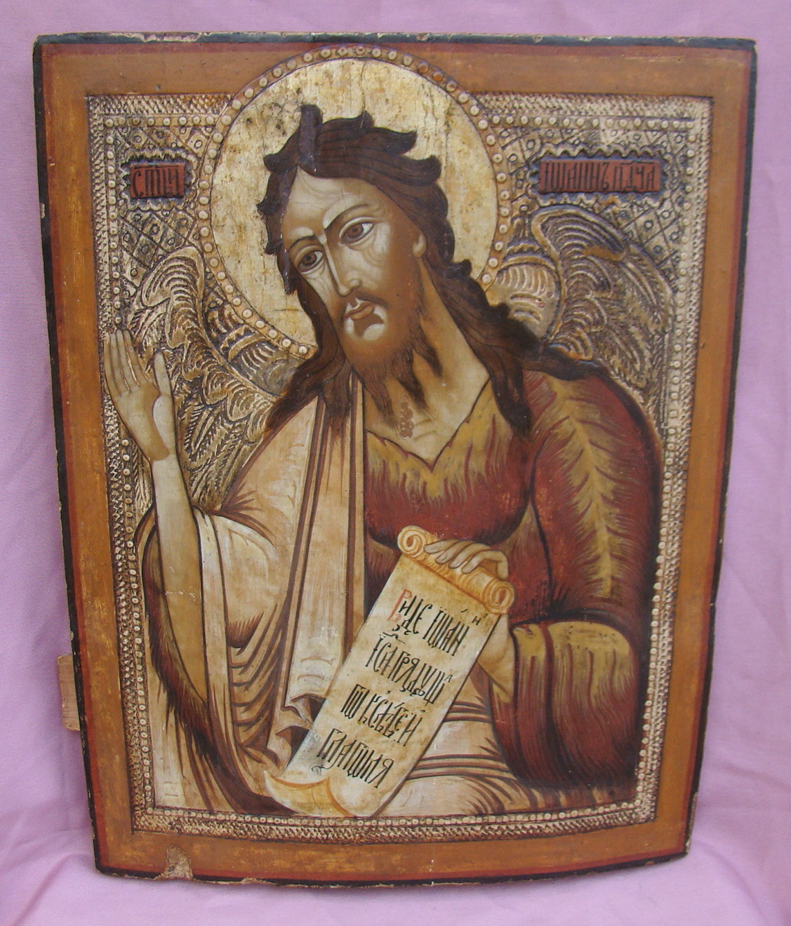 Johannes der Täufer in Halbfigur.Russisch,19.Jahrhundert (um 1800-1840).47x37cm.Sehr gut erhalten.Durch den reliefierten Hintergrund besonders interessant.Ein Sammlerstück!