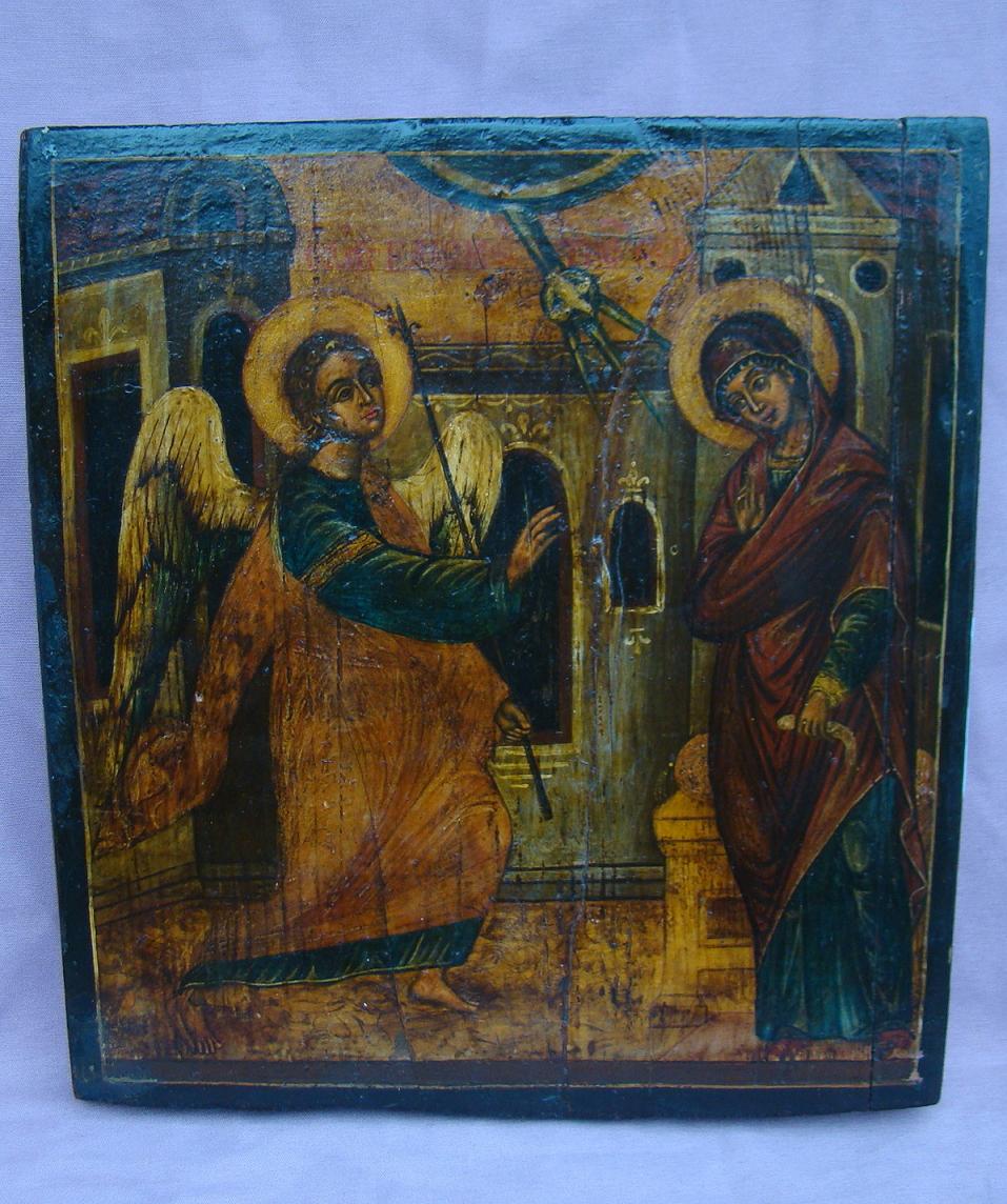 Verkündigung an die Gottesmutter.Griechisch,18.Jahrhundert (um 1700-1750).31x27cm.Griechische Ikonen aus dieser Zeit mit der Darstellung der Verkündigung sind sehr selten.Sammlerstück!