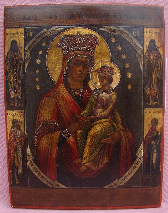 Gottesmutter Bürgin für die Sünder.Russisch,19.Jahrhundert (um 1820-1850).22,5x17,5cm. 4 Randheilige.Sehr gut erhalten,nur minimal restauriert.Seltenes Sammlerstück!