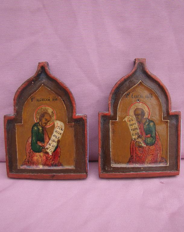 Heiliger Moses und Heiliger Elisej.Russisch,19.Jahrhundert (um 1840-1860).2 Spitzen einer Hausikonostase.Unten beschnitten und angesetzt,sonst gut erhalten. Jeweils 13,5x9,5cm.
