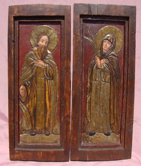 Heiliger Petros Afonski und ehrwürdige Märtyrerin Eudokia.Zwei in Flachrelief geschnitzte und gemalte Ikonen von besonderer Seltenheit.Russisch,Ende 18.Jahrhundert (um 1760-1800).Je ca.40x16cm.