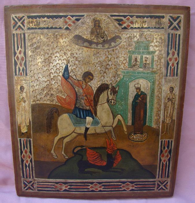 Heiliger Georg,den Drachen tötend.Russisch,19.Jahrhundert (um 1860-1890).35x31cm.Links auf dem Rand der Schutzengel,rechts eine nicht mehr identifizierbare Heilige.Volkstümliche Ikone mit kleinen Restaurierungen.
