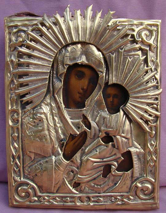 Gottesmutter Hodigitria von Smolensk.Russisch,19.Jahrhundert (um 1860-1880).18x14cm.Mit einem sehr dekorativen vergoldeten Messing Oklad.