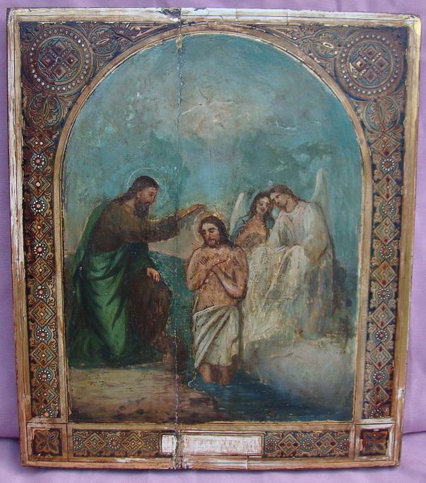 Taufe Christi im Jordan.Zentralrussisch,19.Jahrhundert (um 1870-1890).36x31cm.Die Ikone ist restauriert,mittlerer Erhaltungszustand.