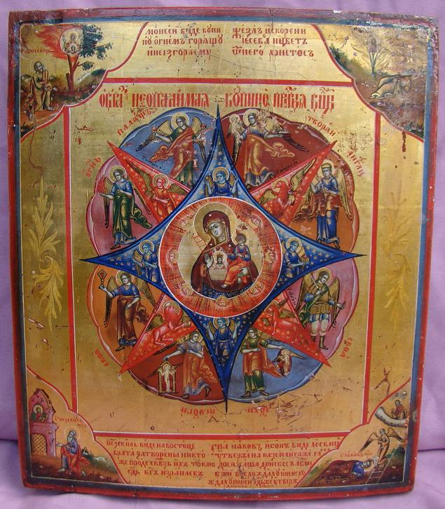 Gottesmutter im brennenden Dornbusch.In den Ecken von oben links im Uhrzeigersinn:Prophet Moses,Prophet Jesaias,Prophet Jakob und Prophet Jesekiel.Russisch,19.Jahrhundert (um 1840-1860).36x30cm.Kleine altersbedingte Fehlstellen,gut erhalten.