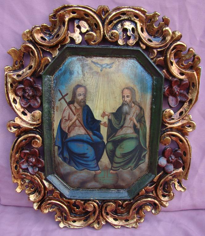 | Heilige Dreifaltigkeit,westlicher Typus.Gottvater,Sohn und Heiliger Geist.Bulgarisch-rumänischer Balkan,19.Jahrhundert (um 1830-1860).46x37cm.Der geschnitzte Rahmen ist original und mit der Ikone zusammenhängend.Der Rahmen wurde neu vergoldet,die Malerei völlig original. |