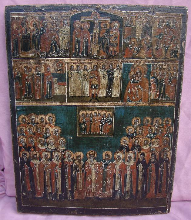 | Mehrfelderikone.Nordrussisch,18.Jahrhundert.Ganz oben die Kreuzigung,unten eine Versammlung von Heiligen (die einzelnen Heiligen werden in der Expertise aufgeschlüsselt).Sehr seltene vielfigurige Auftragsarbeit.Als Auftraggeber kommt nur ein Kloster oder eine vermögende Familie infrage.Über 90 dargestellte Heilige.Seltenes Sammlerstück! |