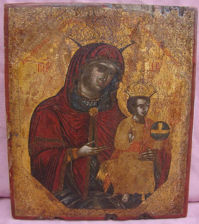 Gekrönte Gottesmutter Hodigitria.Italo-kretisch,15.Jahrhundert.30x25,5cm.Im Innenfeld nur minimal restauriert.Der Randbereich teilweise ausgebessert.Museales Sammlerstück!