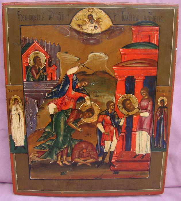 Enthauptung Johannes des Täufers.Russisch,19.Jahrhundert (um 1850-1870).37x30cm.Links der Schutzengel,rechts eine weibliche Heilige.Oben Gottvater in einer Wolkenbank.Sehr gut erhaltene Ikone.