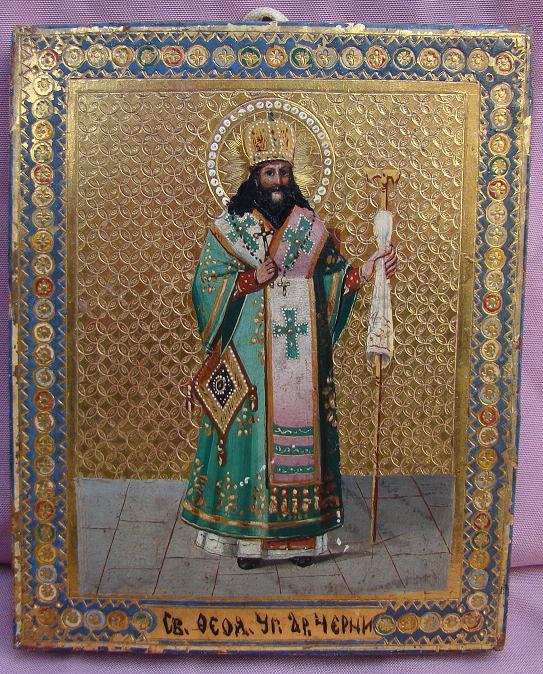 | Heiliger Theodosius Uglitzki,Erzbischof von Tschernigow.Russisch,19.Jahrhundert (um 1880).Der Heilige stammte aus einer adeligen Familie und wurde 1688 Archimandrit (Abt) der Eletzki Klosters.Am 5.Februar 1696 starb er und wurde in der Borisoglebski Kathedrale von Tschernigow beigesetzt.17,5x14cm.Selte Ikone! |