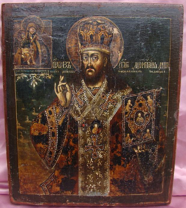 Heiliger Dimetrius,Metropolit von Rostov.Russisch,18.Jahrhundert (um 1750-1780).31x26,5cm.Links oben die Gottesmutter Watopetskaja.Ein selten dargestelltes Motiv.Sammlerstück!