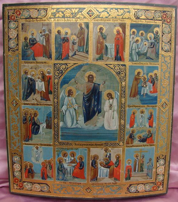 Festtagsikone.Zentralrussisch,um 1890.Die Auferstehung Christi im Zentrum.Umgeben von 12 Hauptfesten des orthodoxen Kirchenjahres.Reich ornamentierter Rand,gut erhalten.36x31cm.Sammlerstück!