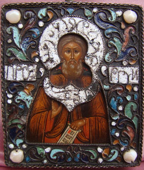 Heiliger Sergius.Russisch,19.Jahrhundert.Emailliertes Messing Oklad mit Perlmutt in den Ecken.8,5x7cm.Ein äusserst seltenes Sammlerstück von besonders hoher Qualität.