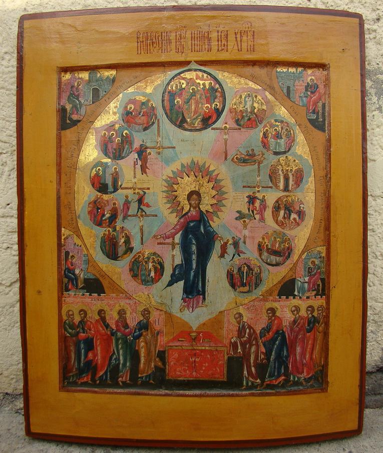 Christus mit Festtagen und den Martyrien der Apostel.In den Ecken die 4 Evangelisten.Zentralrussisch (Palech) 19.Jahrhundert (um 1800-1840).52x44cm.Abgebildet in : Bornheim,Russisch Feinmalerei.Museales Sammlerstück von grosser Seltenheit.