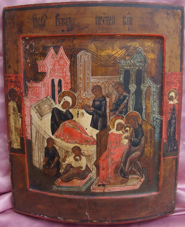 Geburt der Gottesmutter.Russisch,um 1800.Auf den Rändern links der Schutzengel,rechts die Heilige Tatjana.32x25,5cm.Schöne,fast völlig originale Ikone aus Zentralrussland (Moskau?).