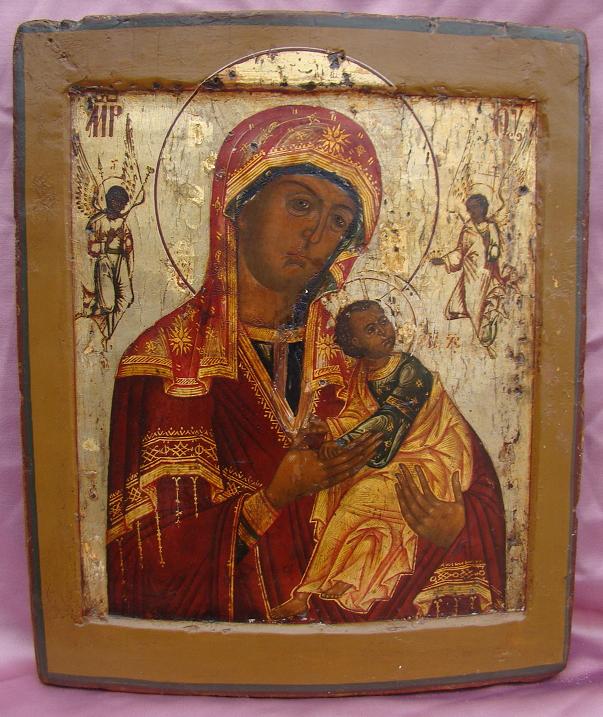 Gottesmutter der Passion (Achtyrskaja).Russisch,18.Jahrhundert (um 1760-1800).32x26cm.Ein besonders schönes Stück,welches auch durch die von griechischen Ikonen bekannte Darstellung (Engel bringen die Leidenswerkzeuge) interessant ist.Sammlerstück!
