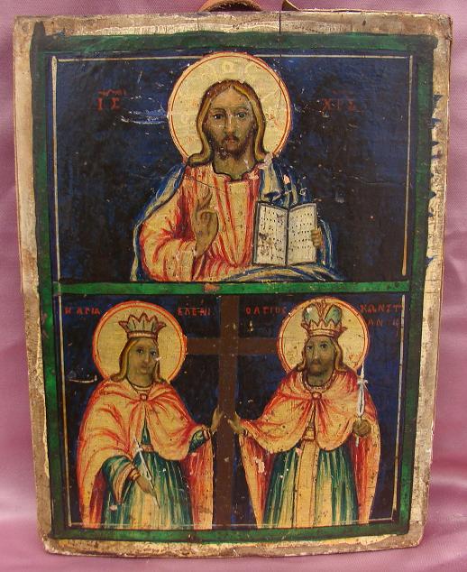 2 Felder Ikone.Oben Christus,unten Konstantin & Helena mit dem wahren Kreuz.Griechisch,19.Jahrhundert (um 1840-1870).25x18,5cm.Schöne griechische Hausikone.