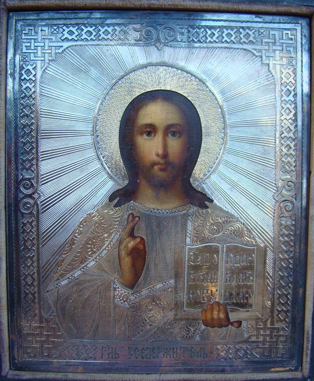 | Christus Pantokrator mit Silberoklad im Kiot.Russisch,Ende 19.Jahrhundert.Silberoklad gestempelt mit 84er Silberstempel,Stadtmarke von Moskau,Meister & Beschaumeistermarke.Der Kiot 16x13,5cm.Die Ikone 13,7x11,3cm.Ein Etikett besagt,das der Verkäufer Degtyarev war.Gute Qualität der kleinen Ikone. |