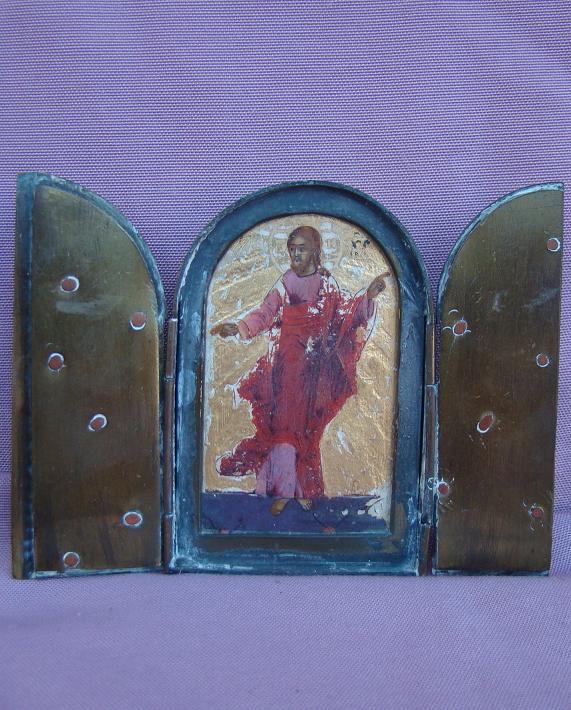 Triptachon mit dem Stehende Christus Pantokrator.Russisch,18.Jahrhundert (um 1750-1790).Aufgeklappt 7,8x10,5cm.Sehr dekorative Messing-Fassung.Sammlerstück!