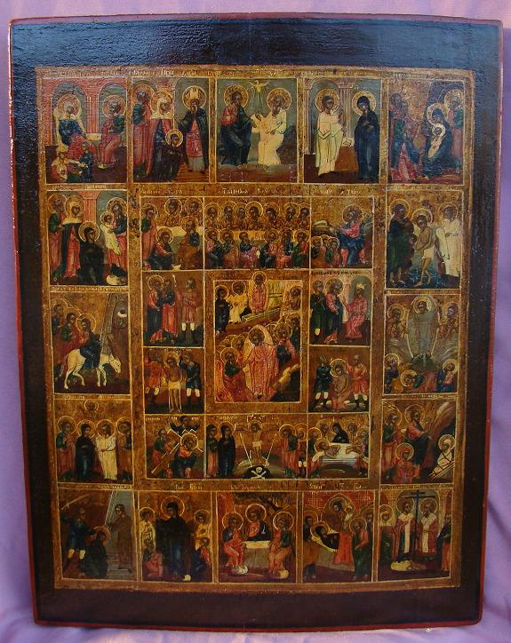 Erweiterte Festtagsikone.Außen die Hauptfesttage,innen die Passion Christi.Russisch,um 1850.Gut erhalten.51x38,5cm.Dekorative Hausikone.