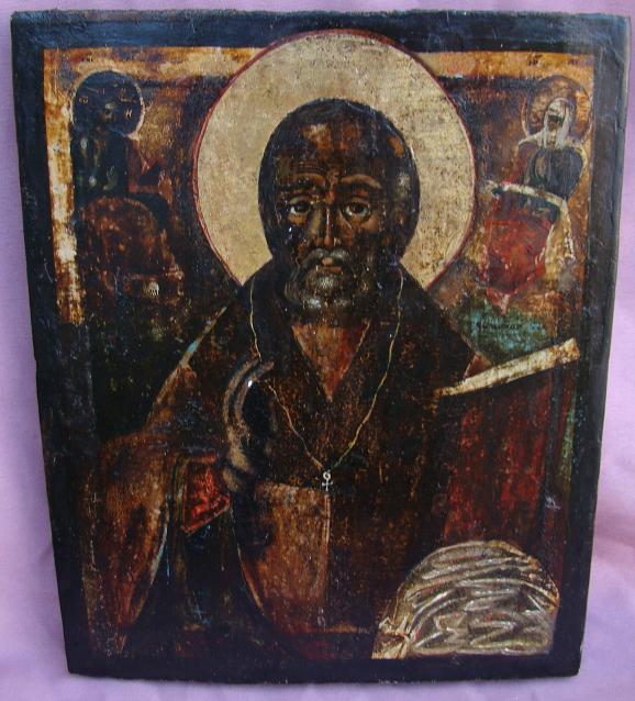 Heiliger Nikolaus.Westrussisch,um 1800.Flankiert von Christus und der Gottesmutter.Einige Restaurierungen.30x24cm.