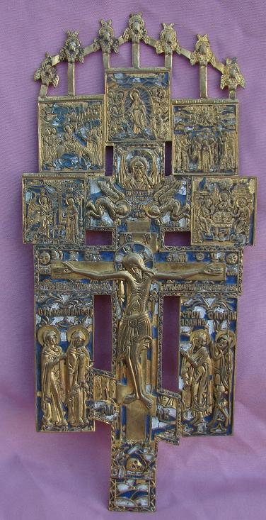 Erweitertes Hauskreuz.Russische Bronzeikone,um 1800.2 farbig emailliert mit Resten von ehemaliger Vergoldung.33,5x15cm.Oben links ein kleiner Schaden.Seltenes Sammlerstück!