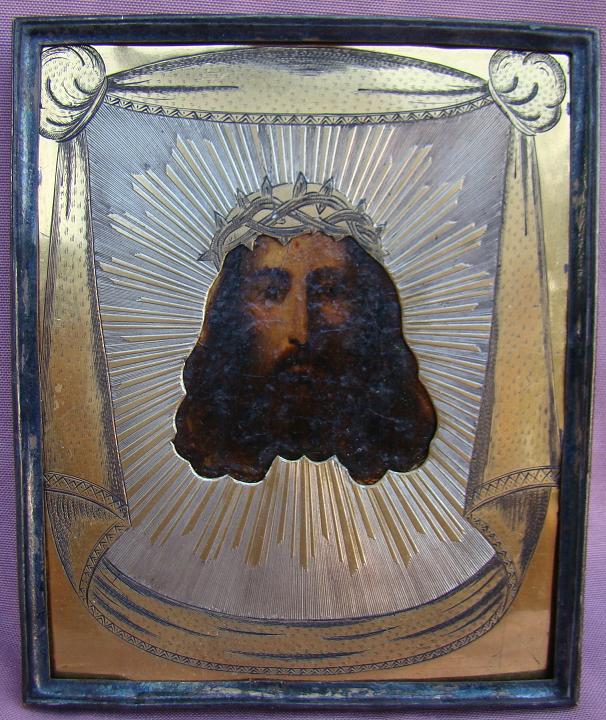 Mandylion Christi mit Silberoklad.Russisch,19.Jahrhundert.14x11,5cm.Auf dem unteren Rand 4 nicht mehr eindeutig lesbare Stempel.Das Silberoklad ist 2 teilig.