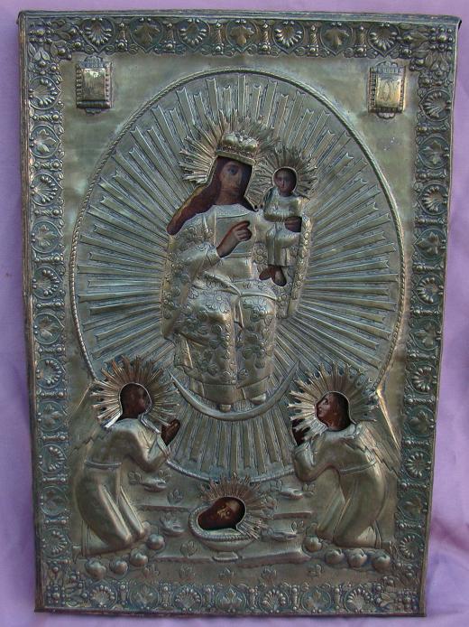 Gottesmutter Adonskaja.Russisch,19.Jahrhundert.Dekoratives Messingoklad.50x33cm.Seltene Darstellung.Sammlerstück!
