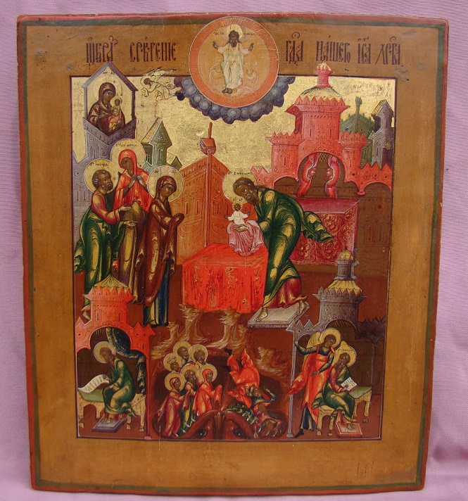 Darstellung Christi im Tempel mit Nebenszenen.Russisch (Palech),Mitte 19.Jahrhundert.Ganz oben der segnende Gottvater,unten der Höllenschlund.30,5x26cm.Sehr seltene Darstellung in Feinmalerei.Seltenes Sammlerstück!
