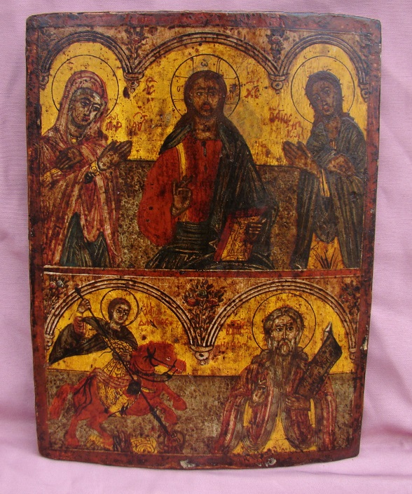 2 Reihen Ikone.Oben die Deesis,unten der Heilige Dimetrius und der Prophet Elias.Griechisch,um 1850.Volkstümliche Hausikone.31x23cm.