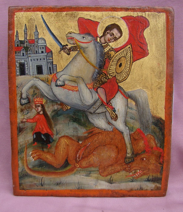 Heiliger Georg,den Drachen tötend.Griechisch,19.Jahrhundert.Kleinere Restaurierungen,Hintergrund erneuert.20x17cm.