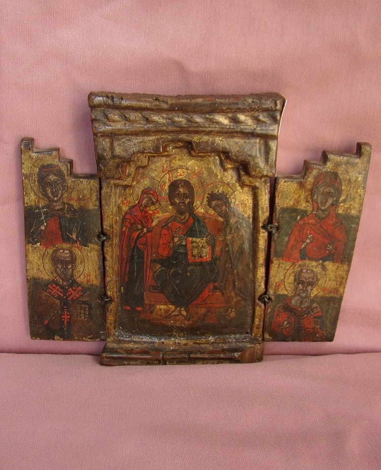 Triptychon.Griechisch,um 1700.Aufgeklappt 18x16cm.Im Mittelfeld die Deesis.Auf de linken Flügel Heiliger Georg &Heiligr Nikolaus.Auf dem rechten Flügel Heilige Paraskeva und Heiliger Athanasius.Seltenes Sammlerstück!