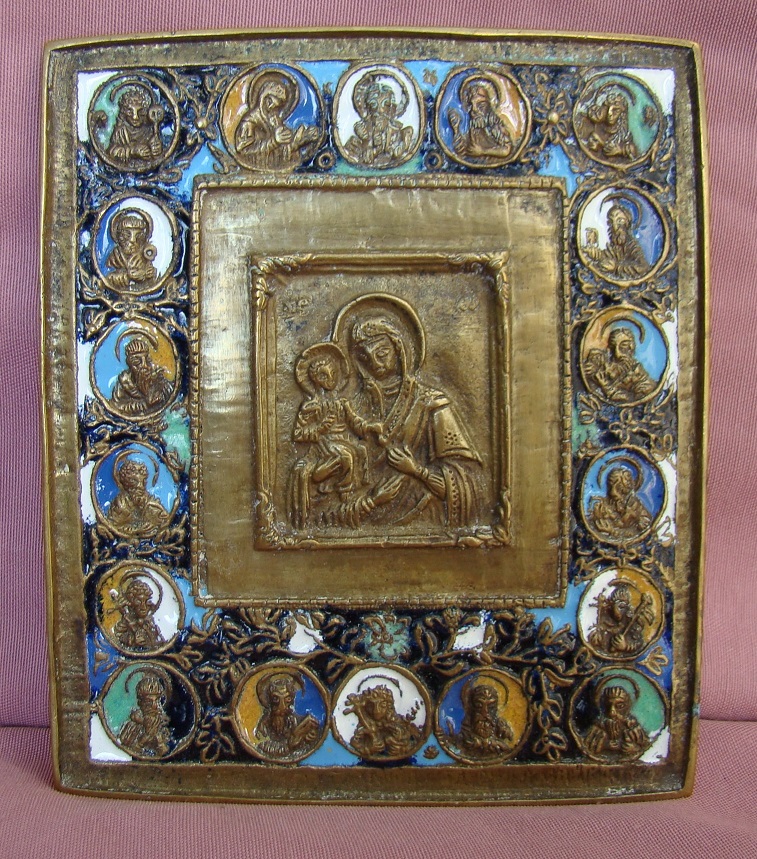 Gottesmutter Tricherusa mit Heiligen.Feiner Guss mit mehrfarbigem Email.19.Jahrhundert.13,5,5x11,6cm.Gut erhalten.