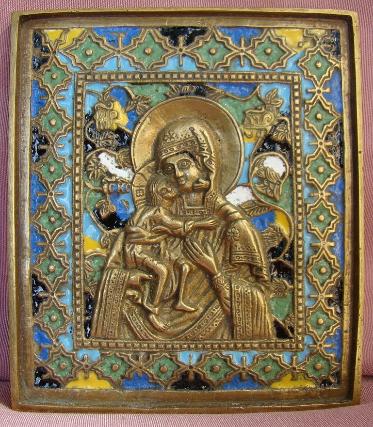 Gottesmutter Feodorovskaja mit mehrfarbigem Email.19.Jahrhundert.Feiner Guss in bester Erhaltung.12,5x11cm.