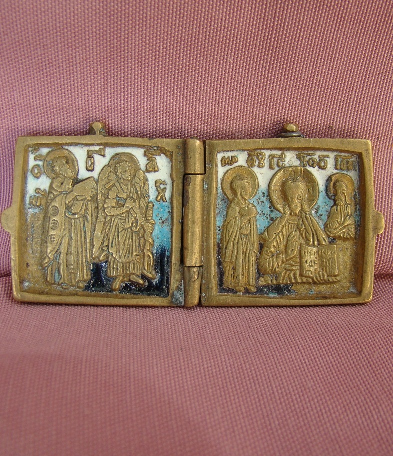 Diptychon mit der Deesis und Heiligen.Mehrfarbiges Email.19.Jahrhundert.Aufgeklappt 3,3x7cm.Selten!