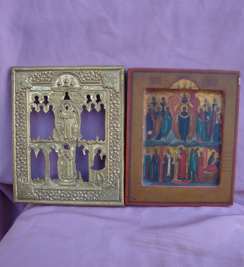Gottesmutter Pokrow.Russisch,19.Jahrhundert.22x18cm.Zur Ikone gehört ein sehr schönes vergoldetes Messingoklad.
