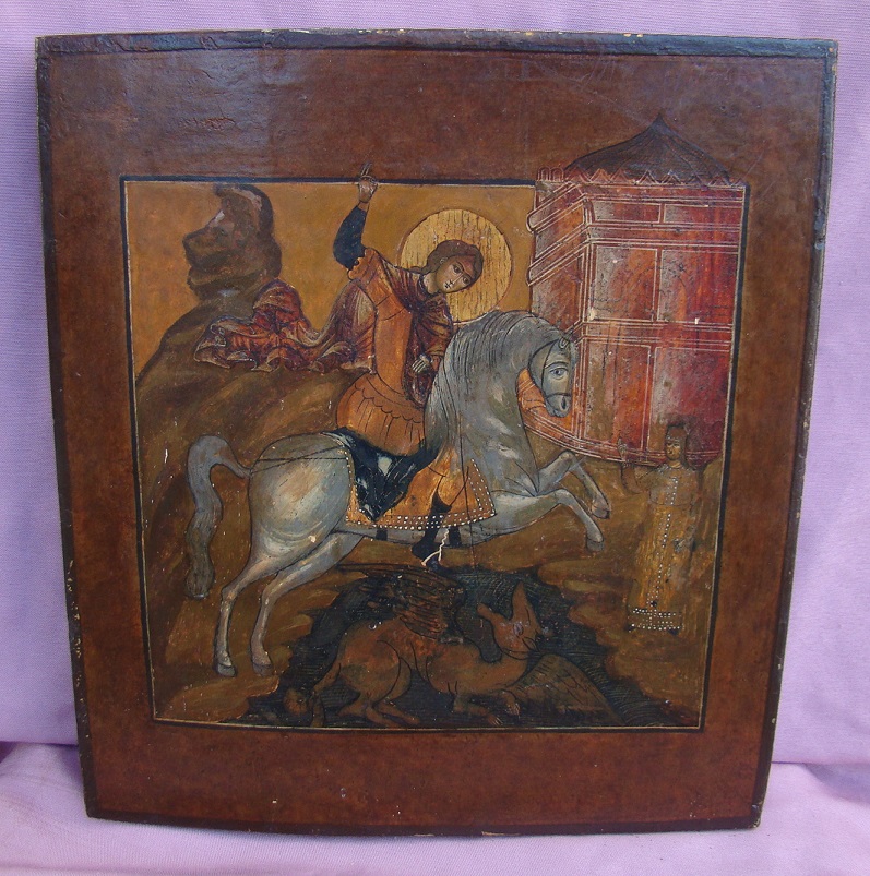 Heiliger Georg,den Drachen tötend.Russisch,19.Jahrhundert.31x27cm.Rand und Hintergrund restauriert.