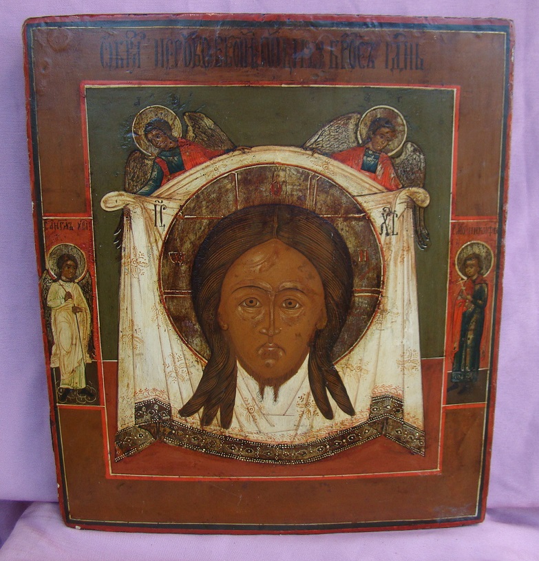 Mandylion Christi.Russisch,19.Jahrhundert.35,5x31cm.Schöne Ikone mit 2 Randheiligen.