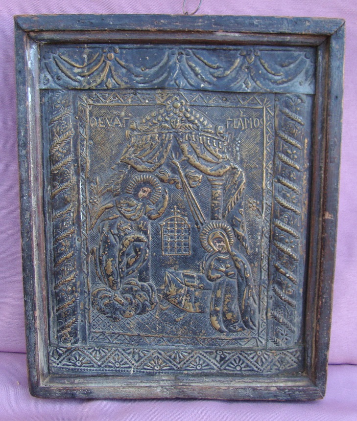 Verkündigung an die Gottesmutter.Griechisch,Anfang 19.Jahrhundert.Getriebenes Messingblech auf Holz,die Köpfe gemalt.22x18cm.Seltenes Sammlerstück!