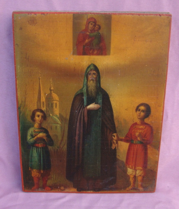 Heiliger Theodor Fürst von Smolensk und Jaroslavl mit seinen beiden Söhnen Konstantin und David.Russisch,19.Jahrhundert.25,5x20cm.Oben eine Ikone der Gottesmutter.Seltenes Sammlerstück!