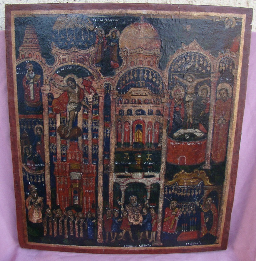 Darstellung von einigen Orten und heiligen Geschehen von Jerusalem (Auferstehungskirche,Berg Golgatha usw.).Russisch,18.Jahrhundert.57x51cm.Wohl aus einer kleinen Kirche oder Kapelle stammend.Sehr seltenes Sammlerstück!