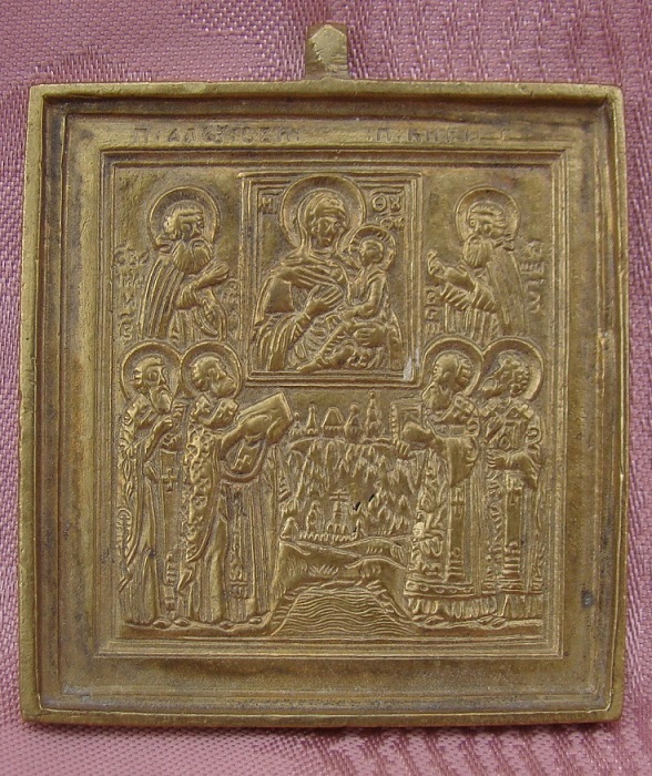 6 Heilige unter der Gottesmutter Hodigitria.Russisch,19.Jahrhundert.6,8x5,5cm.