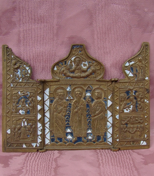 Triptychon Florus,Antipas und Laurus.Auf den Flügeln je 2 Festtage.Russisch,um 1800.Feiner Guss mit farbigem Email.Bechädigungen am Email.Geöffnet 11x15cm.