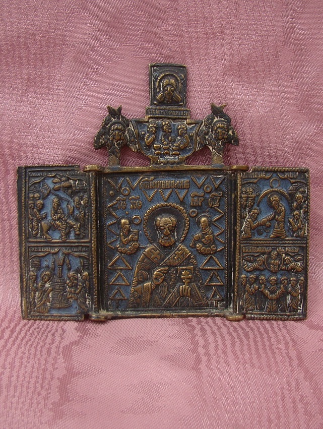 Triptychon Heiliger Nikolaus mit 4 Hauptfesten auf den Flügeln.Darüber die östliche Dreifaltigkeit und das Mandylion Christi.Russisch,um 1800.Blaues Email.Geöffnet 9x10,2cm.